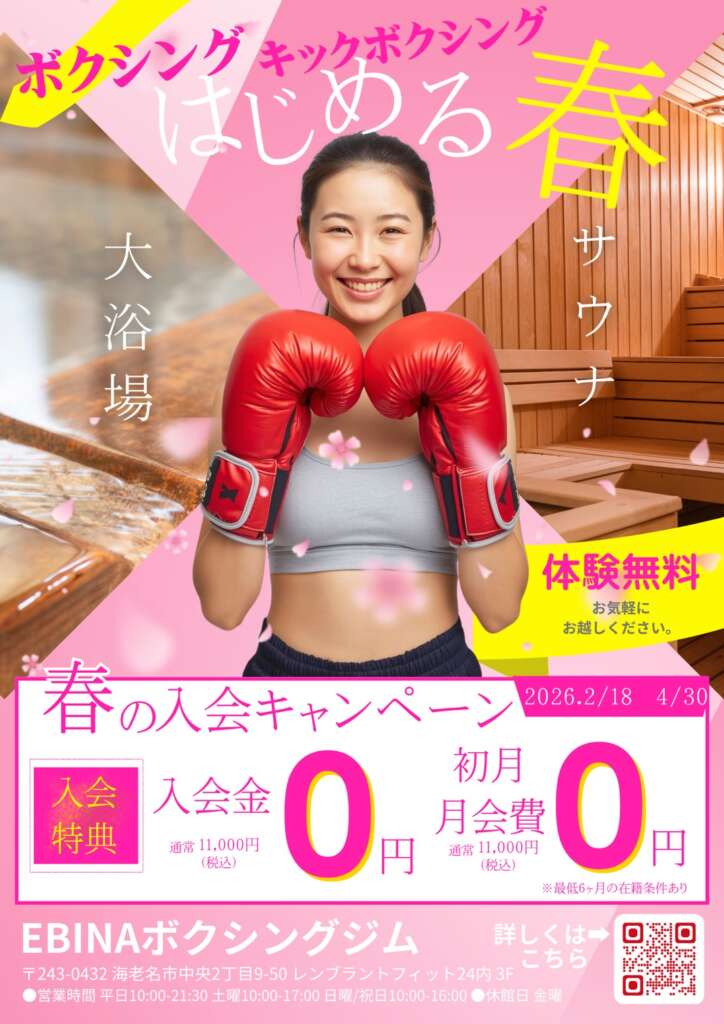 | 🌸暖かくなってきたこの春🌸 ボクシング、始めてみませんか?🥊 新しい季節は、新しいチャレンジのチャンス✨ ✔ 運動が久しぶりの方 ✔ ダイエットしたい方 ✔ ストレス発散したい方 ✔ 何か始めたい方 どなたでも大歓迎です😊 初心者の方がほとんどなのでご安心ください! \ 春の入会キャンペーン実施中 / 🌟入会金 0円 🌟初月月会費 0円 🌟体験無料 まずはお気軽に無料体験へ🌸 一歩踏み出す春にしませんか?🔥 EBINAボクシングジム |